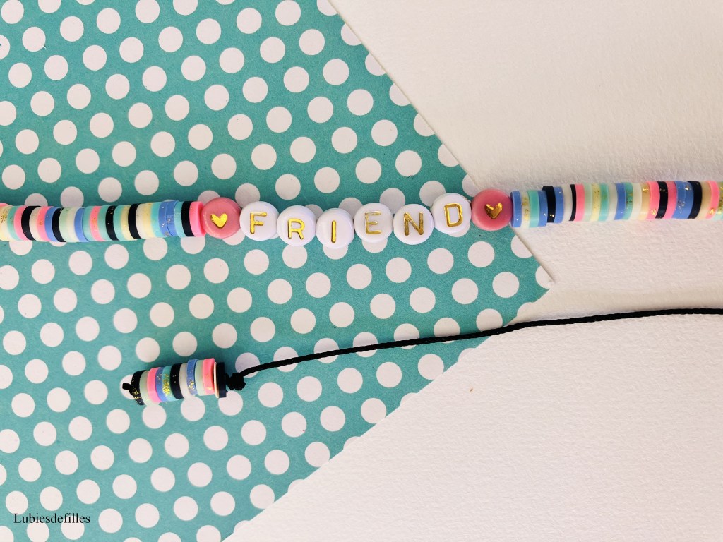 -Enfilez les perles Heishis et vos perles à message, j’ai choisi Love et Friend pour le deuxième collier réalisé. Terminez en faisant un double noeud.