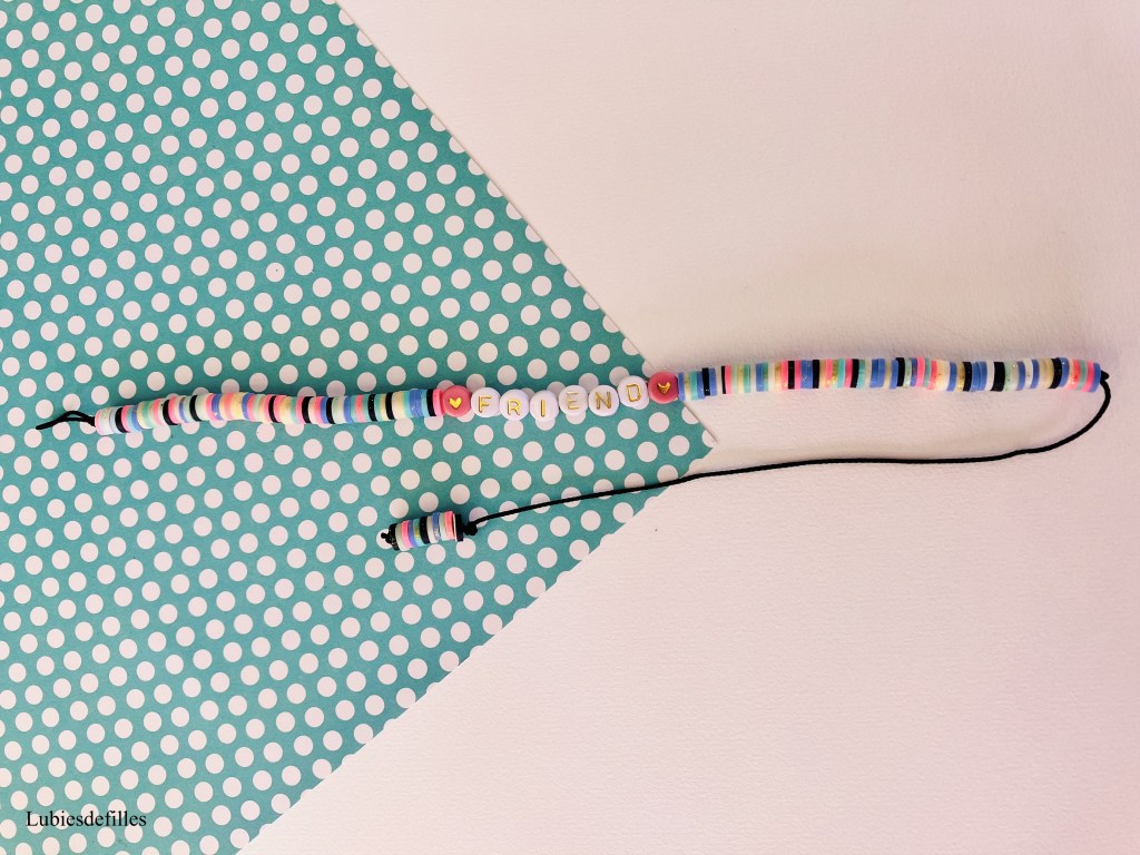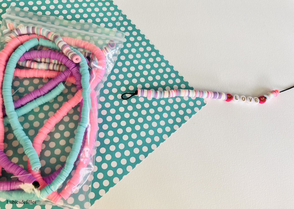 Les perles coeurs, lettres et Heishis pailletées proviennent de le boutique Etsy McboutiqueAtelier, les perles pastels Heishis de la boutique BellaJewelIshop toujours sur Etsy.
