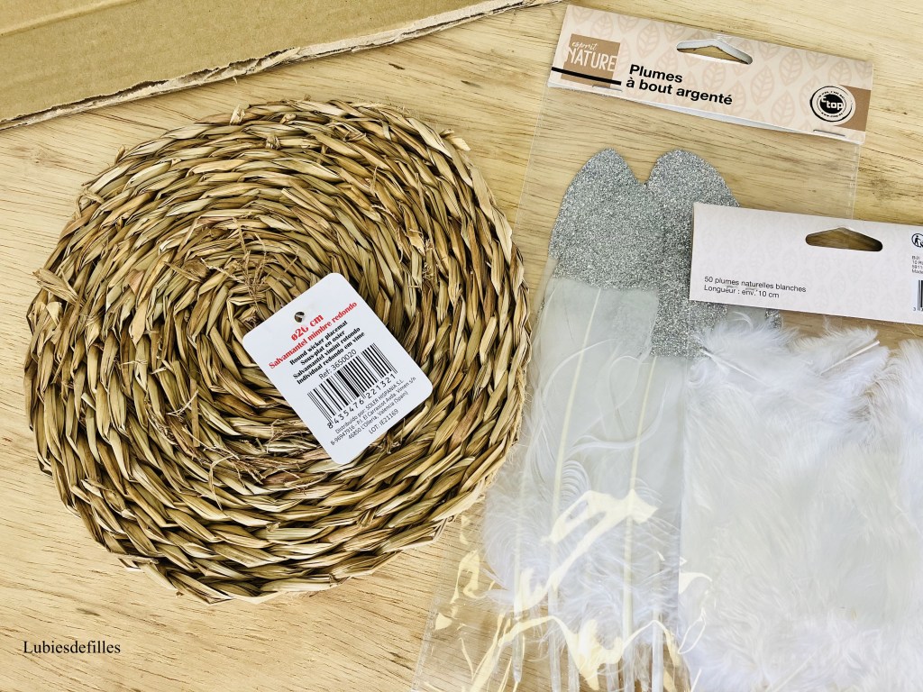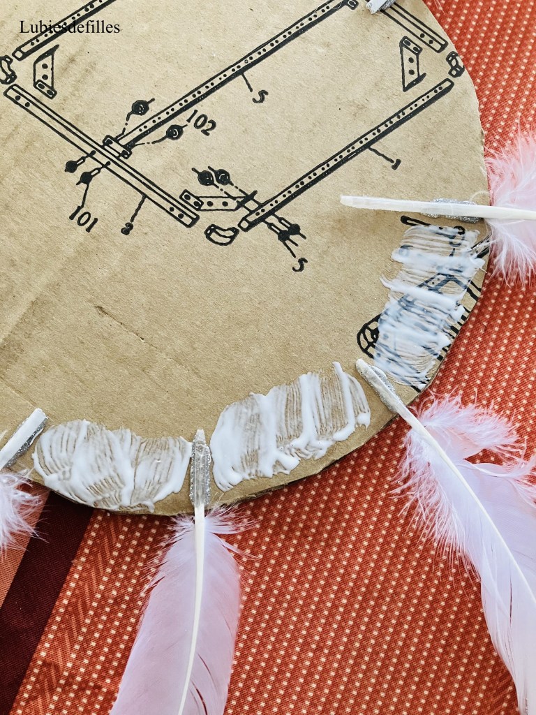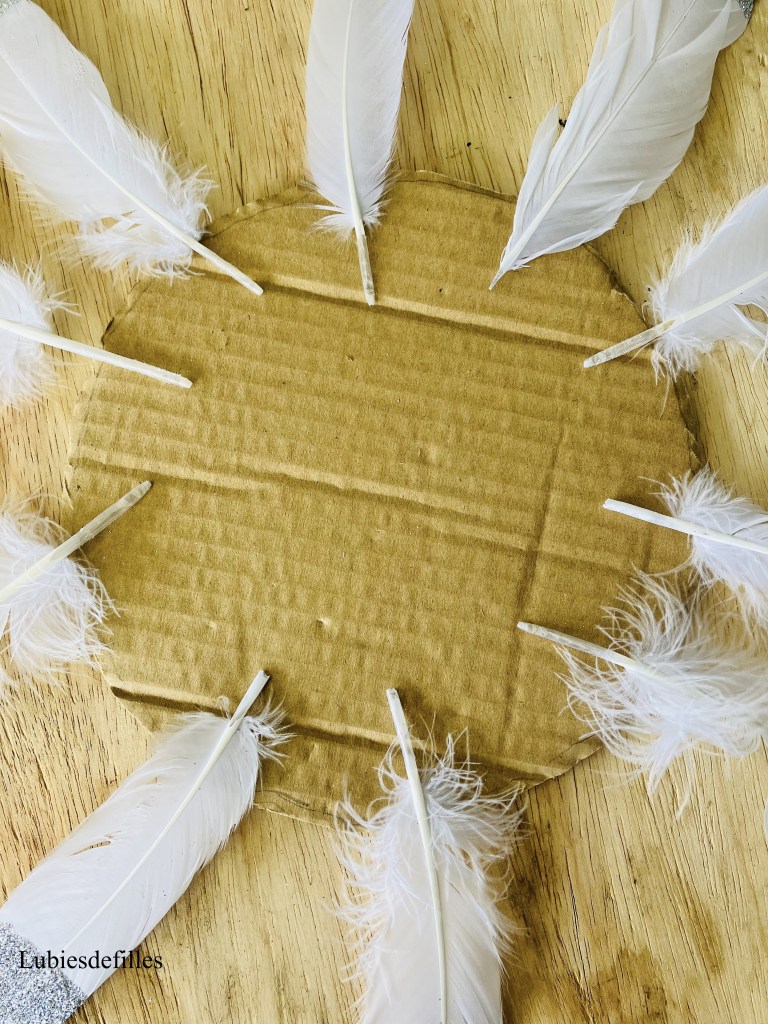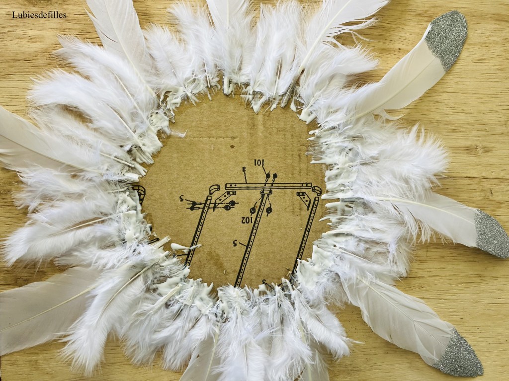 -Placez vos plumes sur le carton afin de voir le rendu puis collez-les. J’ai placé d’abord les grandes plumes. Elles doivent être collées à la colle chaude de préférence.